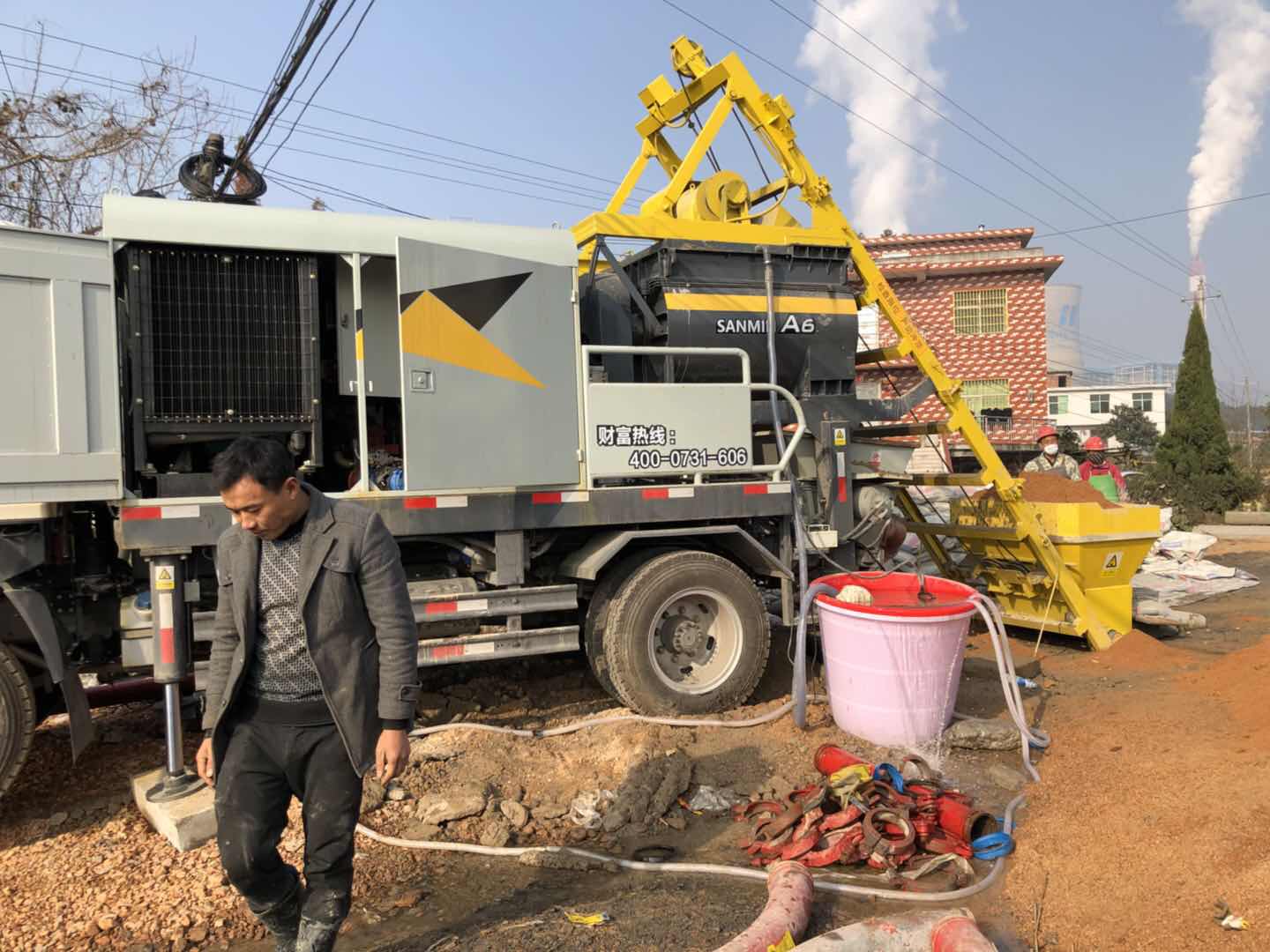 三民重科攪拌泵車領(lǐng)航江城崗下寨村高壓線塔樁施工