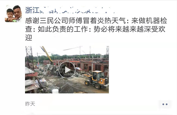 你看,在江西會昌,三民的服務(wù)工程師鉆進(jìn)底盤下,雖然地表的溫度與機器的溫度交織在一起,熱浪滾滾,但他們依舊認(rèn)真地檢修著設(shè)備的每一個部位;在廣東大埔,“草帽哥”呈現(xiàn)的不僅是客戶的認(rèn)可,更是他們執(zhí)著的付出;在福建莆田,他們不忘利用檢修過程中的閑碎時間,教導(dǎo)客戶如何判斷遙控器故障;在浙江嘉興,他們爬上轉(zhuǎn)塔,每一個螺栓、每一根油管,都在仔細(xì)地檢查著,而客戶自發(fā)豎起的大拇指,就是對他們工作最好的認(rèn)可與回報。