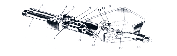 (1)(2)主油缸;(3)水箱;(4)換向裝置;(5)(6)混凝土缸;(7)(8)混凝土活塞;(9)料斗;(10)分配閥;(11)擺臂;(12)(13)擺動(dòng)油缸;(14)出料口 小型混凝土輸送泵的活塞是與主油缸的活塞桿連接,在主油缸液壓油作用下,作往復(fù)運(yùn)動(dòng)時(shí),一缸前進(jìn),則另一缸后退;混凝土缸出口與料斗連通,分配閥一端接出料口,另一端通過(guò)花鍵軸與擺臂聯(lián)接,在擺動(dòng)油缸作用下,可以左右擺動(dòng),這就是達(dá)到往外推。